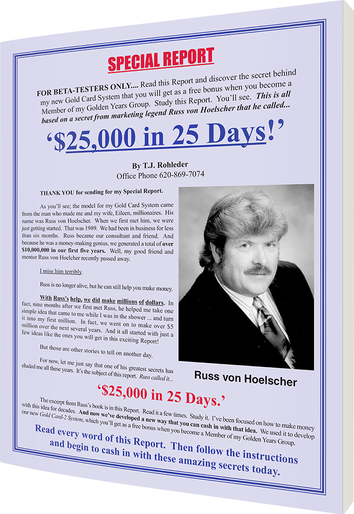 Terms: The name "$25,000 in 25 Days" is a reference to our friend Russ's original secret from his book written in 1987. It is not in any way a statement, promise, or guarantee that you will make that amount or any amount of money. Submitting this Form allows us to email you a copy of our Report and followup with you by email, phone (live or auto-dialed messages), mail, or any means necessary to communicate with you about this invitation. You can opt-out at any time.